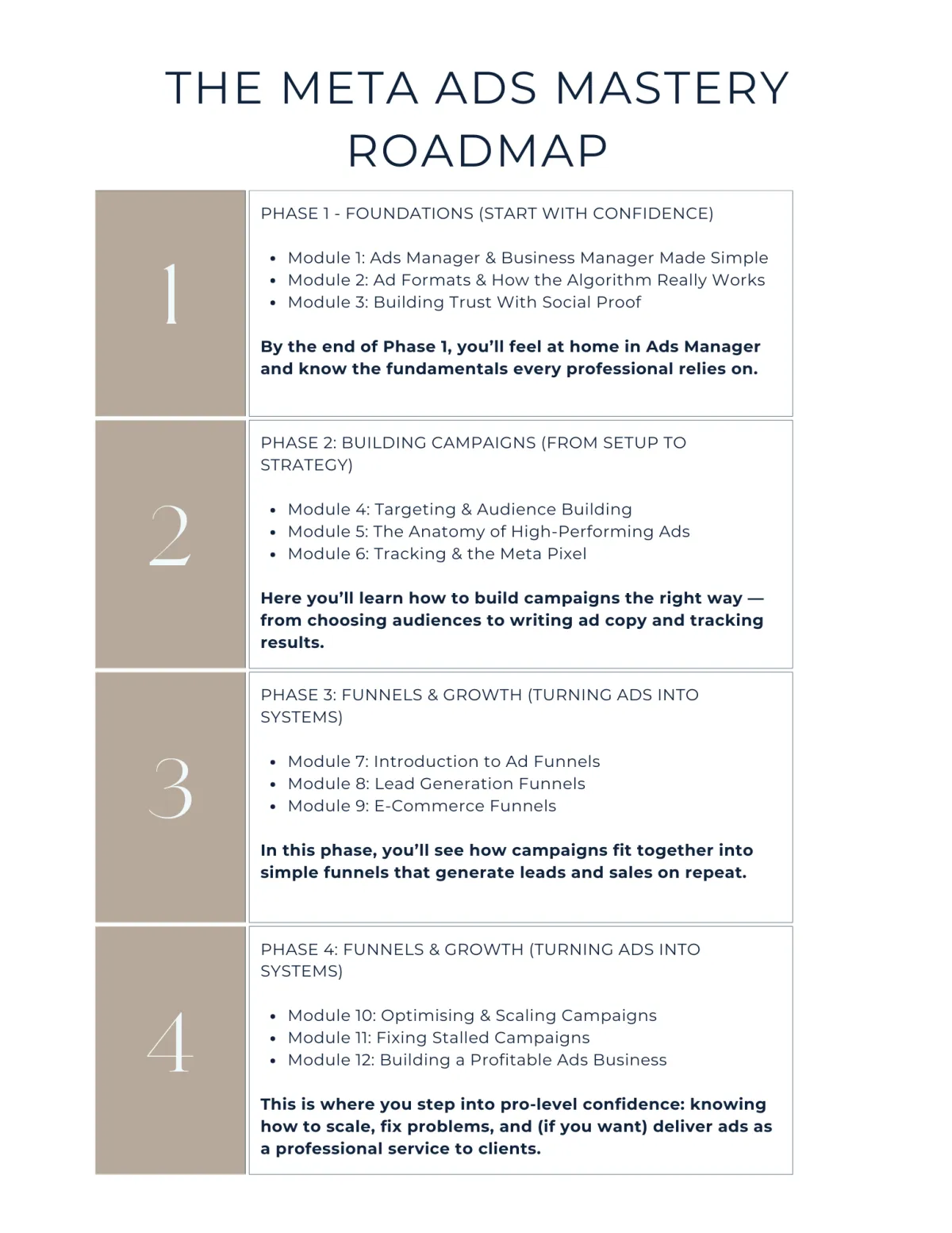 Learn Meta ads in a way that actually fits into real life. Whether it’s before the kids wake up, during a lunch break, or while you’re working from your favourite café, each video is short, practical, and designed to get you taking action immediately.